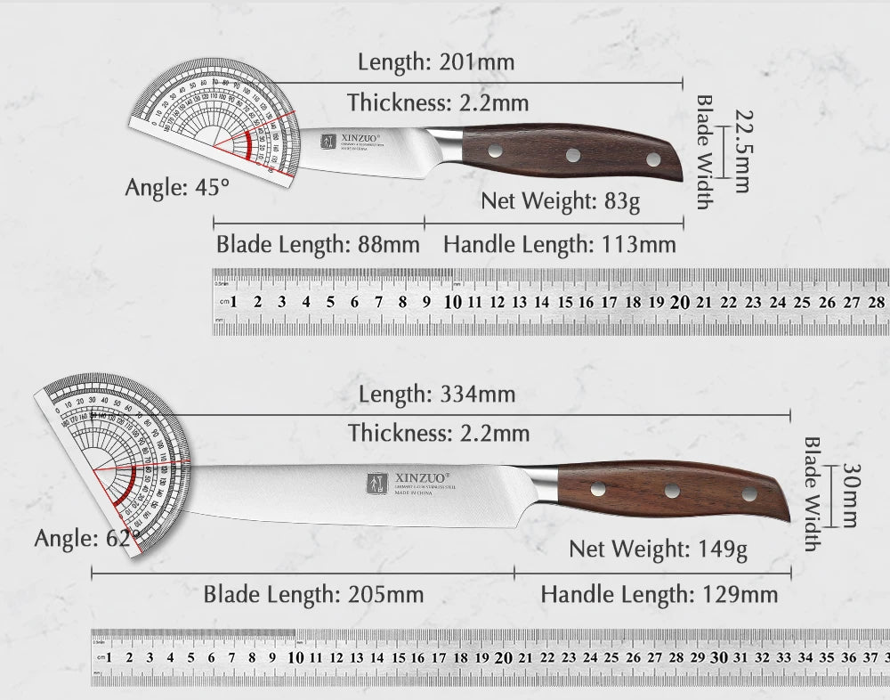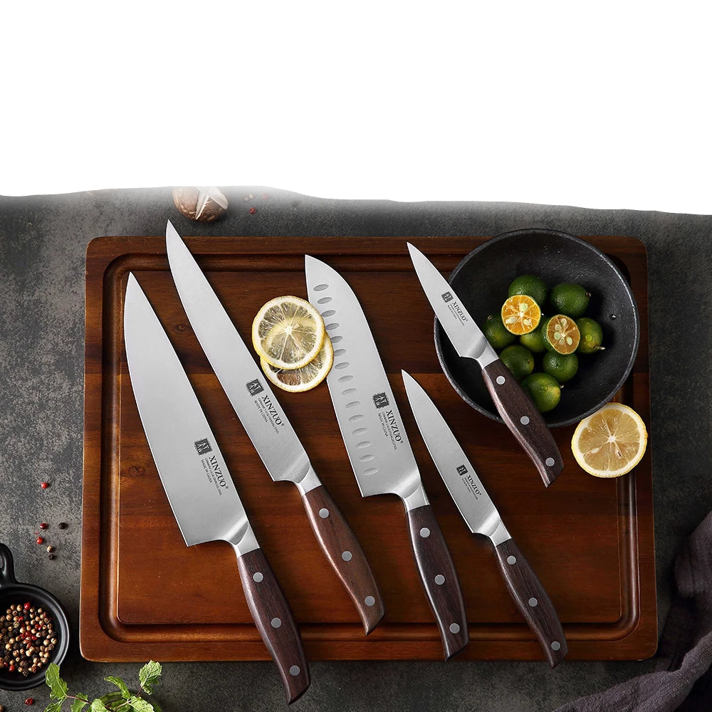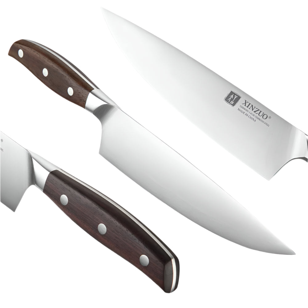 סט סכיני מטבח איכותי מבית XINZUO, המיוצר מפלדת אל-חלד גרמנית באיכות גבוהה לחיתוך מדויק, מהיר ונוח. הסכינים מתאימים לשימוש יומיומי במטבח הביתי וגם לשפים מקצועיים, עם עמידות גבוהה, חדות יוצאת דופן ועיצוב אלגנטי ופרקטי.